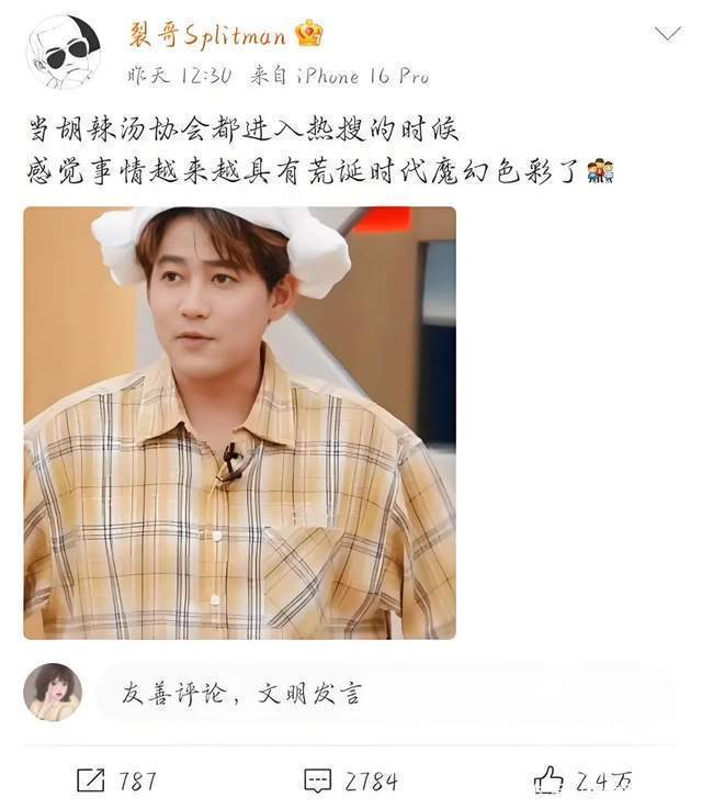 随后他又在小号发文表示:当胡辣汤协会都进入热搜的时候,感觉事情越来越具有荒诞时代魔幻色彩了。这说明他根本就没有意识到自己真正的错误所在:不只是发言的用词错误,还有公众人物审慎发言的必要性。其实,苏醒之前就被网友扒出有“不尊重女性”的言论,这足以说明文化素养对于明星来讲还是挺重要的。所以这两年着重提高艺人文化课成绩,提高准入门槛,不是没有道理的。